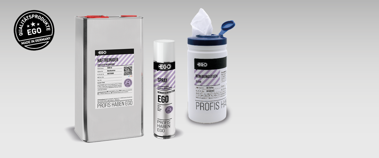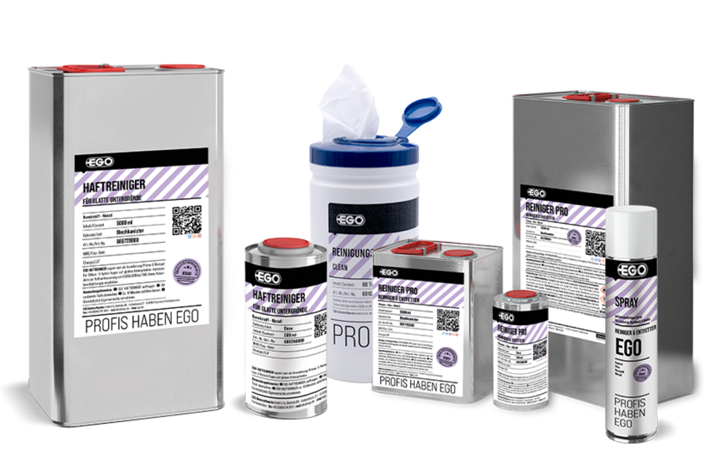 The right cleaners for carefree processing of adhesives and sealants. The cleaners in particular should be gentle and at the same time carefully remove dirt and residues from the surface so that the adhesive or sealant can achieve full adhesion. Compatibility is an essential component between the products used and, thanks to the high quality testing system at EGO, enables low-complaint and long-lasting use in the specified area of application.