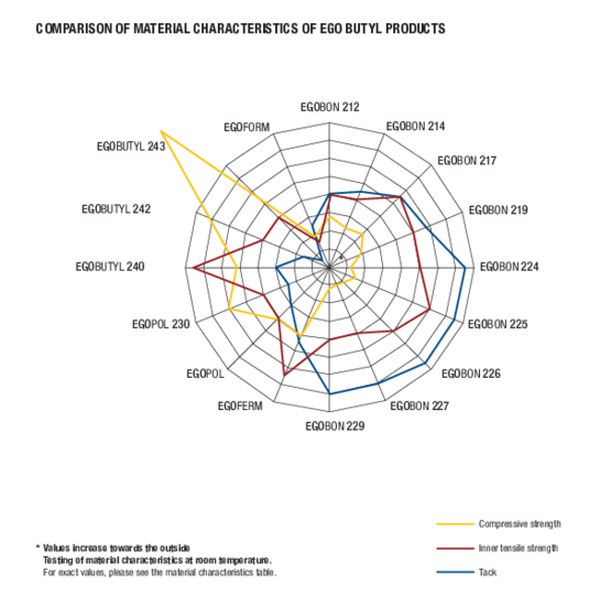 EGO Butyl tapes are malleable sealing tapes with precise profile structures, which have been used as an addition or alternative to the usual injection sealants for more than 40 years. EGO Butyl, which is ready for immediate use, is particularly noted for high and long-lasting adhesive power, ageing and weather-resistance – just pure Butyl. The versatile material properties of the EGO Butyl products and the individual forms offer an extraordinary range of possible applications.They comply with the application recommendations of the IVD leaflet no. 5. International test certificates and expert reports confirm the excellent characteristics of the EGO products.
