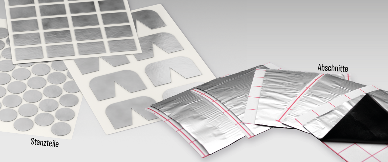 sections, on the other hand, are designed for rectangular shapes or round cords and can be produced with individual cutting patterns of the carrier materials, for example as sheets, strips or individual designs.
