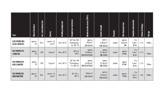 Possibilities of Shore A hardness, acc. total deformation, density, handling temperature, temperature resistance, module/tensile stress, tensile strength, viscosity, skin formation time, complete vulcanisation, volume shrinkage, form of delivery and storage.